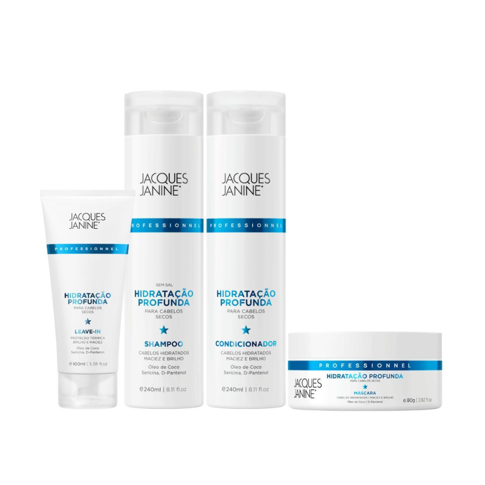 A linha Hidratação Profunda Jacques Janine foi desenvolvida para recuperar a maciez e vitalidade dos fios ressecados, proporcionando uma hidratação intensa e duradoura desde a primeira aplicação. Sua fórmula rica em óleos e ativos emolientes penetra profundamente na fibra capilar, devolvendo nutrição, brilho e movimento natural aos cabelos.