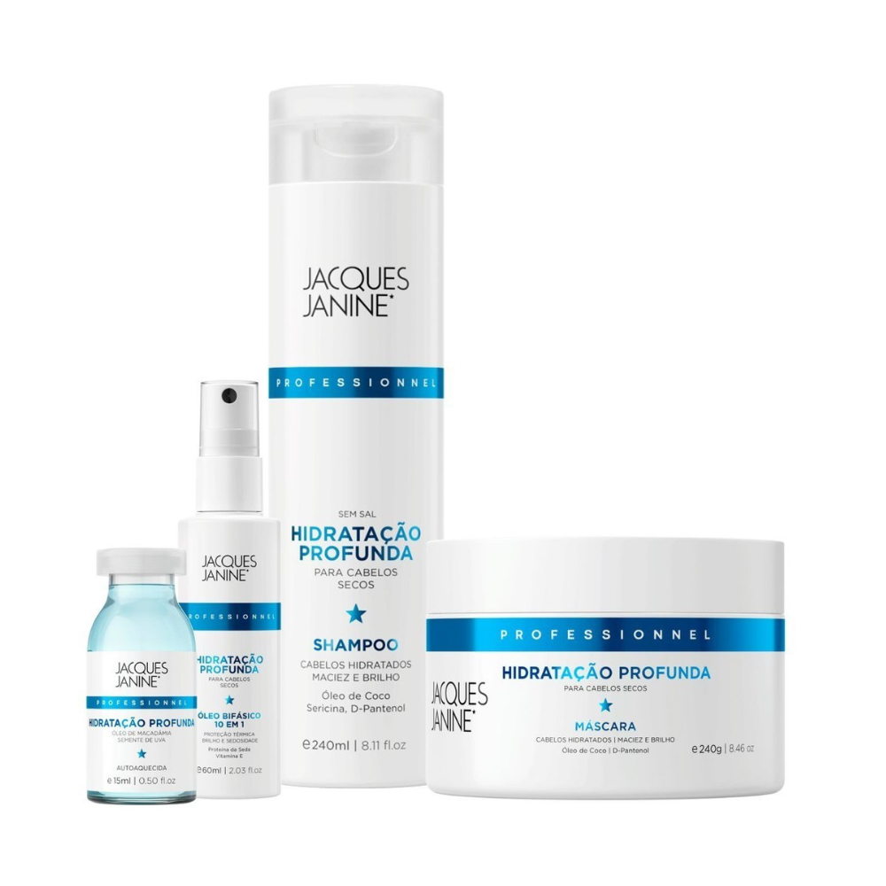 A linha Hidratação Profunda Jacques Janine foi desenvolvida para recuperar a maciez e vitalidade dos fios ressecados, proporcionando uma hidratação intensa e duradoura desde a primeira aplicação. Sua fórmula rica em óleos e ativos emolientes penetra profundamente na fibra capilar, devolvendo nutrição, brilho e movimento natural aos cabelos.