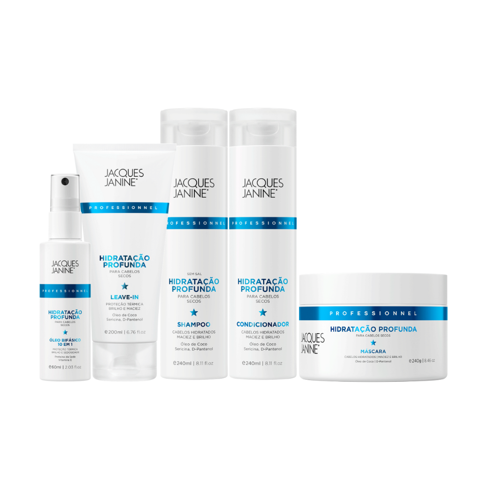 A linha Hidratação Profunda Jacques Janine foi desenvolvida para recuperar a maciez e vitalidade dos fios ressecados, proporcionando uma hidratação intensa e duradoura desde a primeira aplicação. Sua fórmula rica em óleos e ativos emolientes penetra profundamente na fibra capilar, devolvendo nutrição, brilho e movimento natural aos cabelos.