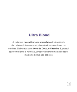 Os produtos da linha Ultra Blond agem profundamente na fibra capilar, neutralizando eficazmente os indesejados tons amarelados que podem surgir com o tempo. Além de manter o loiro sempre radiante, a linha também confere brilho intenso e suavidade ao toque, resultando em cabelos visivelmente mais saudáveis e bonitos.