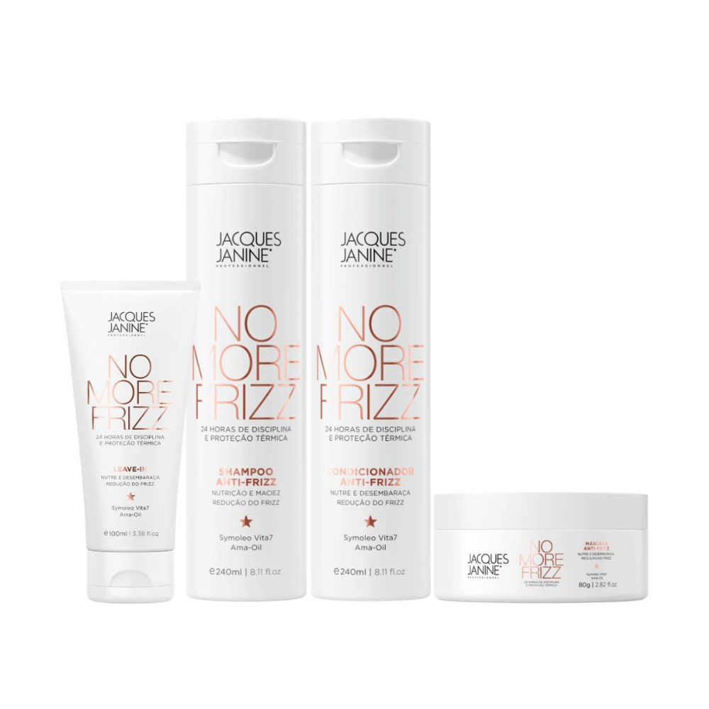 A linha No More Frizz proporciona hidratação profunda, fortalecendo os fios e controlando o volume por até 24 horas. Formulada com ingredientes de alta qualidade, ela combate o frizz de maneira eficaz, deixando seu cabelo macio, brilhante e com aparência saudável ao longo do dia. Experimente a revolução no cuidado capilar com No More Frizz e sinta a diferença em cada mecha.